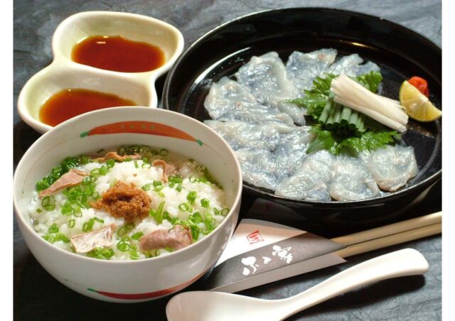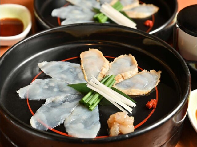 店主の好みはふぐ専用醬油で喰らう厚切りのてっさ